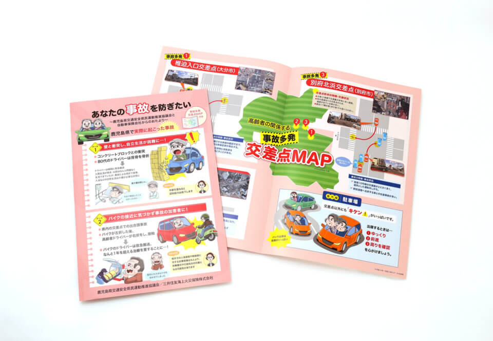 そんな想いから、三井住友海上火災保険株式会社・鹿児島保険金お支払センター様が手がけた交通安全チラシ。
